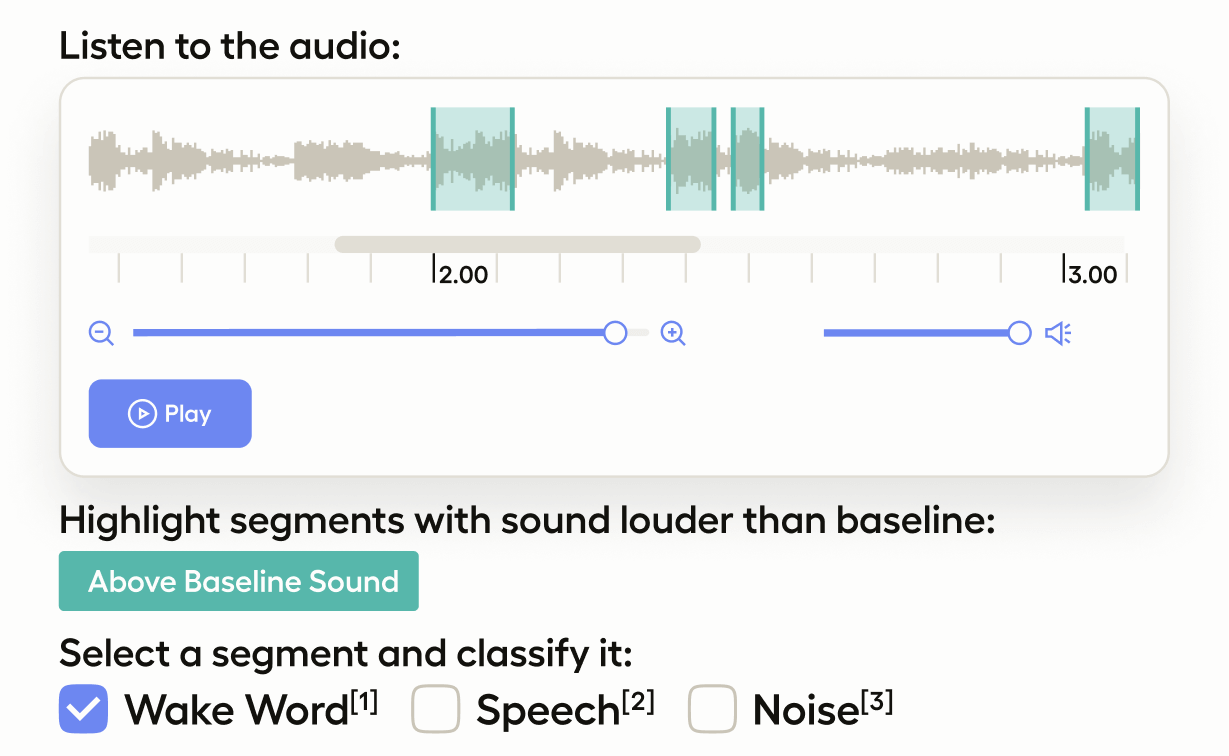 The choice="multiple" parameter allows annotators to select both “Speech” and “Wake Word” as options for a specific segment. The perRegion parameter means that each classification applies to a specific audio segment.